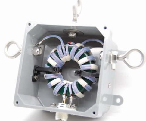簡単に言うと、これは1MHzから54MHzの高電力に対応する電流バランです。ラダーライン給電のマルチバンドダブレットやコブラ給電の同軸給電方式を変換したり、オフセンター給電のダイポールを周囲に構築したりするのに最適です。